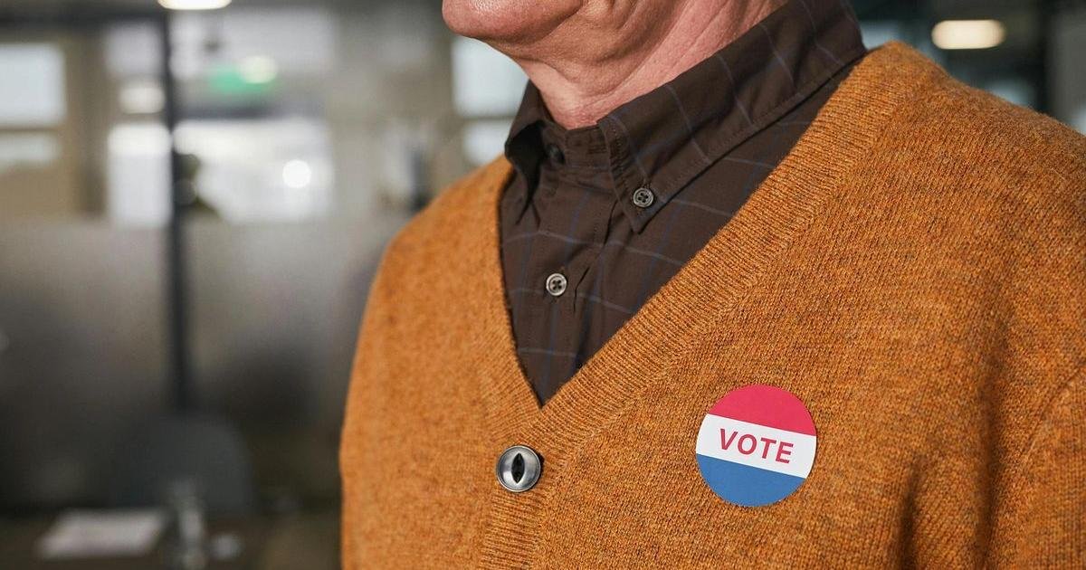 A man wearing a brown sweater and plaid shirt has a round red, white, and blue “VOTE” button pinned to his chest. Photo: Edmond Dantès / Pexels